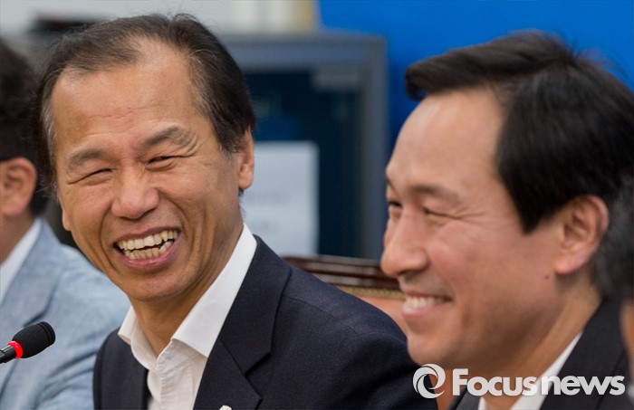 (서울=포커스뉴스) 16일 오전 서울 여의도 국회 더불어민주당 원내대표회의실을 방문한 최문순 강원도지사가 우상호 원내대표와 함께 웃고 있다.