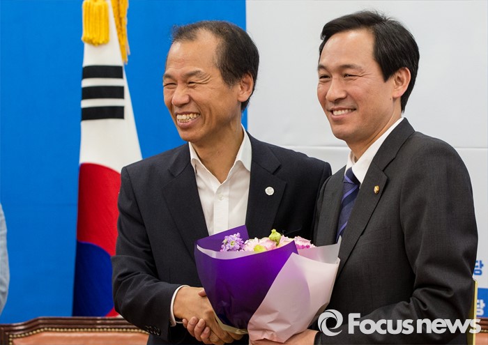 (서울=포커스뉴스) 16일 오전 서울 여의도 국회 더불어민주당 원내대표회의실을 방문한 최문순 강원도지사가 우상호 원내대표에게 당선 축하 꽃다발을 받은 후 악수하고 있다.
