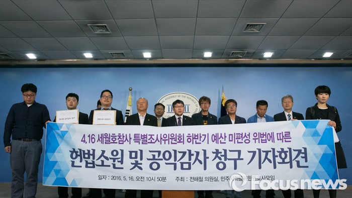 (서울=포커스뉴스) 16일 오전 서울 여의도 국회 정론관에서 민주사회를 위한 변호사모임 등 관계자들이 4·16 세월호참사 특별조사위원회 하반기 예산 미편성 위법에 따른 헌법소원 및 공익감사 청구 기자회견을 하고 있다.