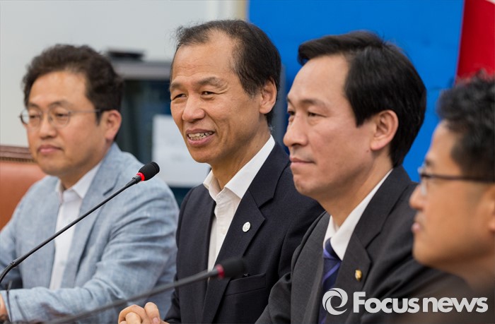 (서울=포커스뉴스) 16일 오전 서울 여의도 국회 더불어민주당 원내대표회의실을 방문한 최문순 강원도지사 인사말을 하고 있다.