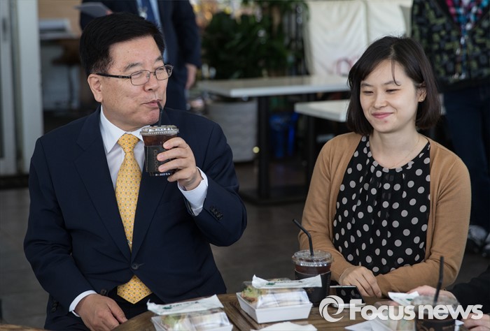 (서울=포커스뉴스) 김광림 새누리당 정책위의장이 16일 오후 서울 여의도 한강공원의 한 카페에서 열린 '3040여성당직자 브라운백 미팅'에서 한 당직자와 대화를 나누다 커피를 마시고 있다.