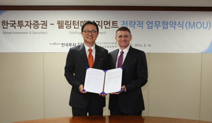 지난 연말 기준 운용규모는 전세계 55개 국가, 2100개 기관 자금을 대상으로 한 9270억 달러(원화기준 1000조원) 에 이르는 초대형 글로벌 운용사다.16일 한국투자증권 본사에서 한국투자증권과 웰링턴매니지먼트가 MOU(전략적 사업제휴)를 맺고 기념사진을 촬영하고 있다. 왼쪽부터 유상호 한국투자증권 사장, 레이 헬퍼(Ray E. Helfer) 웰링턴매니지먼트 아시아태평양 대표.