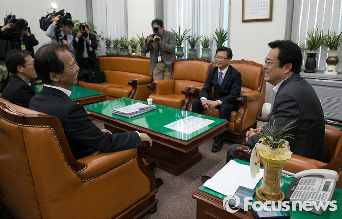 (서울=포커스뉴스) 정진석(오른쪽) 새누리당 원내대표가 16일 오후 서울 여의도 국회를 방문한 최문순 강원도지사와 만나 면담을 하고 있다.