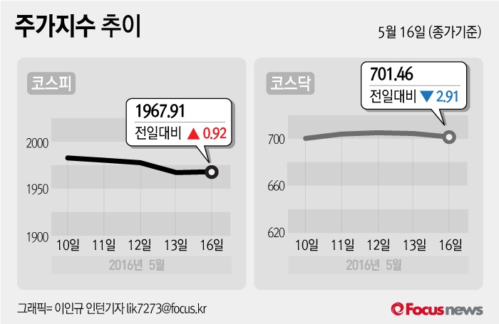 (서울=포커스뉴스) 16일 코스피지수는 전날 보다 0.05%(0.92포인트) 오른 1967.91에 장을 마쳤다. 코스닥지수는 전일 대비 0.41%(2.91포인트) 내린 701.46에 마감했다.