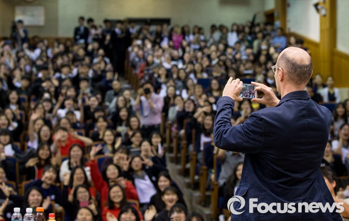 (서울=포커스뉴스) 16일 오후 서울 종로구 서울예술고등학교를 찾은 프랑스 작가 베르나르 베르베르가 '오늘날의 예술적 지능'이란 주제로 강연 도중 학생들을 촬영하고 있다.