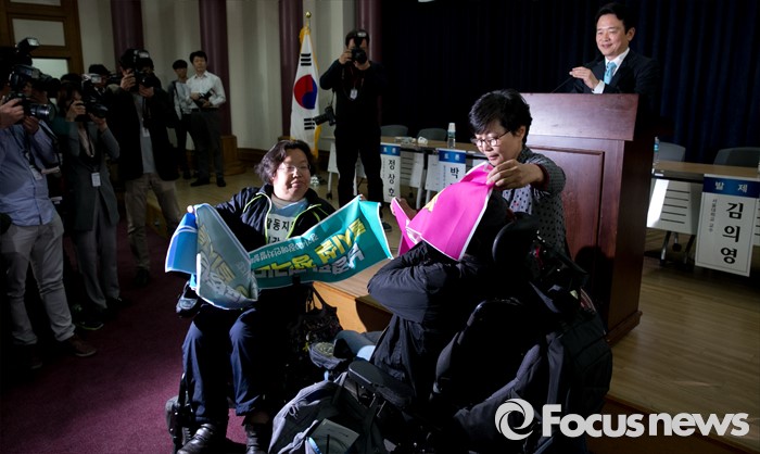 (서울=포커스뉴스) 16일 오후 서울 여의도 국회 의원회관에서 열린 '20대 국회, 협치 가능한가' 토론회에 참석한 남경필 경기도지사의 인사말 도중 장애인 이동권 보장을 요구하는 경기420장애인차별철폐공동투쟁단 등이 남 지사와 면담을 요구하며 손피켓을 들고 있다.