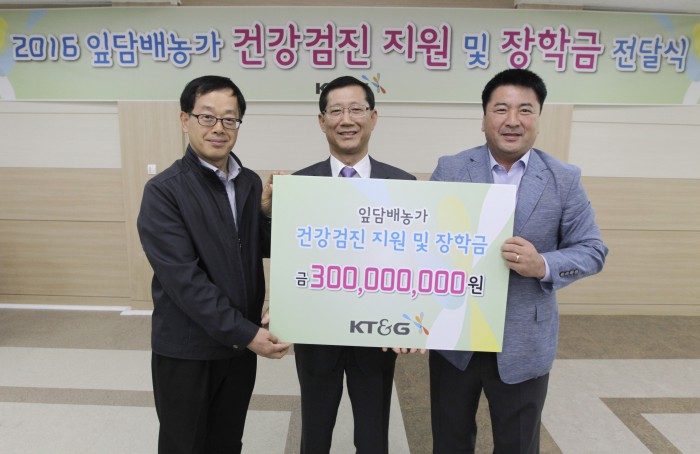 KT&G는 잎담배 경작인 1004명에 대한 종합 건강검진비와 저소득 농가 자녀 39명의 장학금 등으로 3억원을 지원한다고 16일 밝혔다.