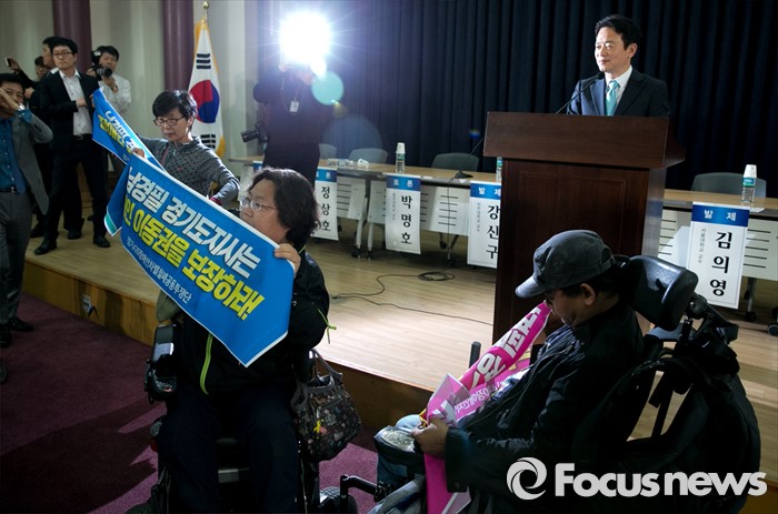 (서울=포커스뉴스) 16일 오후 서울 여의도 국회 의원회관에서 열린 '20대 국회, 협치 가능한가' 토론회에 참석한 남경필 경기도지사의 인사말 도중 장애인 이동권 보장을 요구하는 경기420장애인차별철폐공동투쟁단 등이 남 지사와 면담을 요구하며 손피켓을 들고 있다.