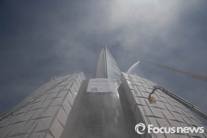 (서울=포커스뉴스) 16일 오후 서울 송파구 제2롯데월드몰에서 소방관들이 '재난대응 안전한국훈련'에 참가해 화재 진압 훈련을 하고 있다.