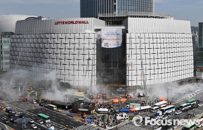(서울=포커스뉴스) 16일 오후 서울 송파구 제2롯데월드몰에서 소방당국이 '재난대응 안전한국훈련'에 참가해 화재진압 훈련을 하고 있다.