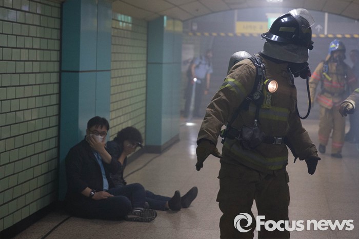(서울=포커스뉴스) 16일 오후 서울 송파구 잠실역에서 시민들이 '재난대응 안전한국훈련'에 참가해 대피훈련을 하고 있다.