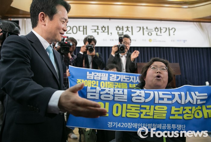 (서울=포커스뉴스) 16일 오후 서울 여의도 국회 의원회관에서 열린 '20대 국회, 협치 가능한가' 토론회에 참석한 남경필 경기도지사의 인사말 도중 장애인 이동권 보장을 요구하는 경기420장애인차별철폐공동투쟁단 등이 남 지사와 면담을 요구하며 손피켓을 들고 있다.
