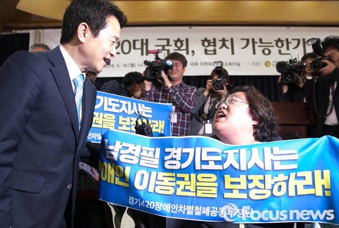 (서울=포커스뉴스) 16일 오후 서울 여의도 국회 의원회관에서 열린 '20대 국회, 협치 가능한가' 토론회에 참석한 남경필 경기도지사의 인사말 도중 장애인 이동권 보장을 요구하는 경기420장애인차별철폐공동투쟁단 등이 남 지사와 면담을 요구하며 손피켓을 들고 있다.