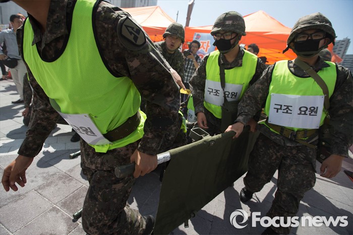 (서울=포커스뉴스) 16일 오후 서울 송파구 제2롯데월드몰에서 군인들이 '재난대응 안전한국훈련'에 참가해 인명구조 훈련을 하고 있다.