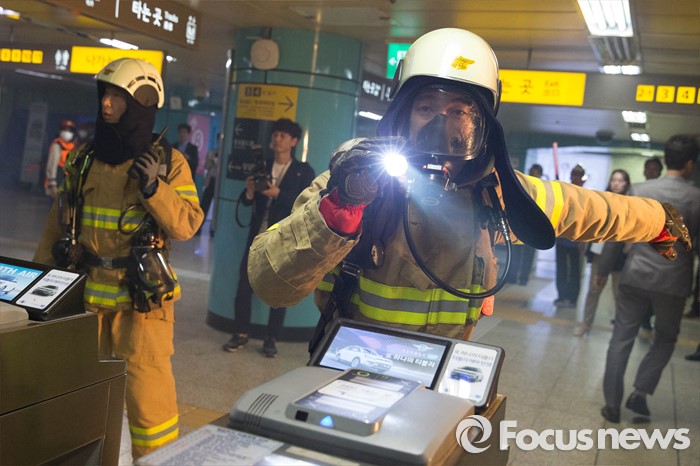 (서울=포커스뉴스) 16일 오후 서울 송파구 잠실역에서 구조대원들이 '재난대응 안전한국훈련'에 참가해 대피훈련을 하고 있다.