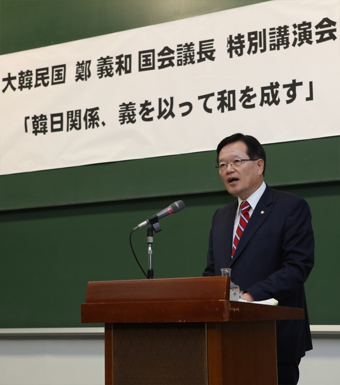 (서울=포커스뉴스) 일본을 공식 방문중인 정의화 국회의장이 16일 오전 일본 중앙대에서 '한일관계, 의(義)로써 화(和)를 이루자'란 주제로 강연을 하고 있다. <사진제공=국회>