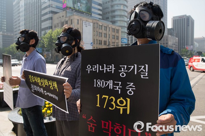 (서울=포커스뉴스) 17일 오전 서울 종로구 광화문광장 인근에서 서울환경연합원들이 경유차 활성화 정책 철회를 촉구하며 퍼포먼스를 벌이고 있다.