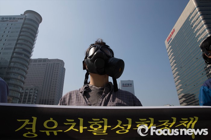 (서울=포커스뉴스) 17일 오전 서울 종로구 광화문광장 인근에서 서울환경연합원들이 경유차 활성화 정책 철회를 촉구하며 퍼포먼스를 벌이고 있다.