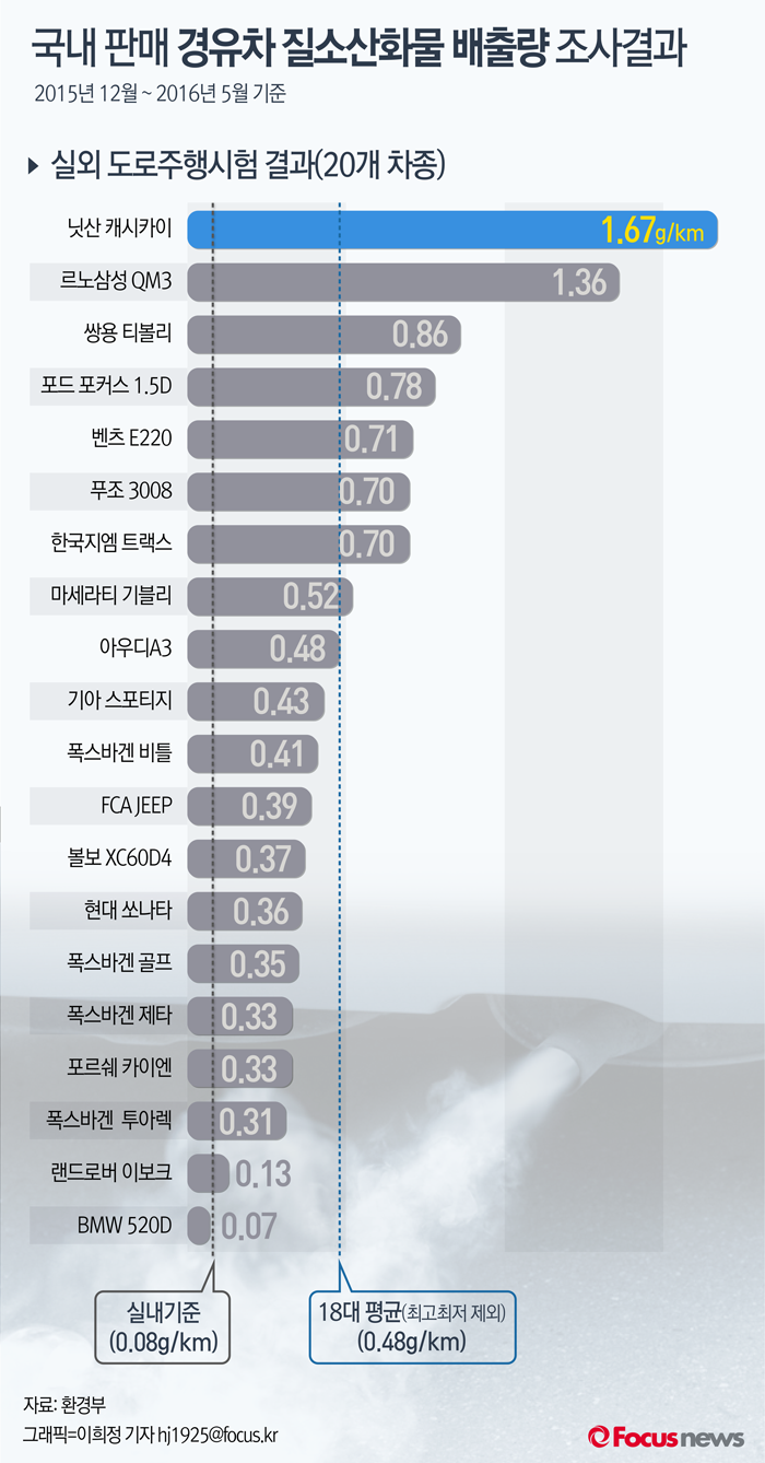 (서울=포커스뉴스) 16일 발표한 환경부 자료에 따르면 실외 도로주행시험에서 질소산화물 배출량은 캐시카이가 1.67g/km로 인증기준(0.08g/km)의 무려 20.8배를 기록해 가장 높았다.