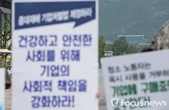 (서울=포커스뉴스) 17일 오전 서울 광화문광장에서 열린 '옥시 불매, 사업장 옥시 OUT' 선언 기자회견에 참석한 민주노총 조합원 및 가습기 살균제 피해자 가족들이 중대재해 기업처벌법 재정을 요구하는 손팻말을 들고 있다.
