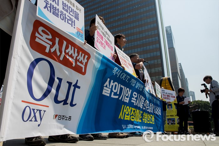 (서울=포커스뉴스) 17일 오전 서울 광화문광장에서 열린 '옥시 불매, 사업장 옥시 OUT' 선언 기자회견에 참석한 민주노총 조합원 및 가습기 살균제 피해자 가족들이 옥시를 규탄하는 손팻말을 들고 있다.