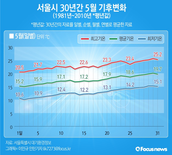 서울시 기후대기통계자료에 따르면 30년간 5월 17일 기준 서울 일별 평균기온은 최저기온 12.2℃, 최고기온 22.8℃였다.