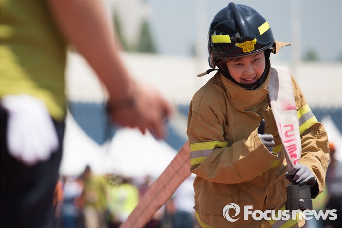 (서울=포커스뉴스) 17일 오전 서울 양천구 목동운동장에서 열린 2016 의용소방대 종합소방기술경연대회에서 참가자들이 소방호스 끌기 경기를 하고 있다.