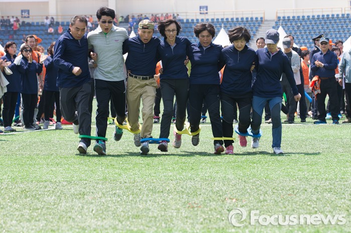 (서울=포커스뉴스) 17일 오전 서울 양천구 목동운동장에서 열린 2016 의용소방대 종합소방기술경연대회에서 참가자들이 7인8각 경기를 하고 있다.