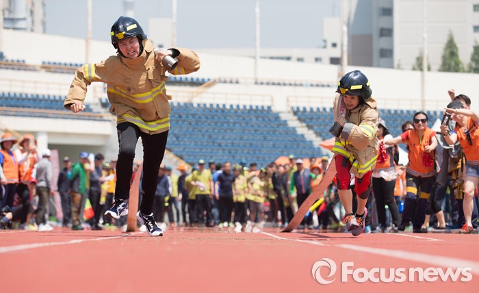 (서울=포커스뉴스) 17일 오전 서울 양천구 목동운동장에서 열린 2016 의용소방대 종합소방기술경연대회에서 참가자들이 소방호스 끌기 경기를 하고 있다.