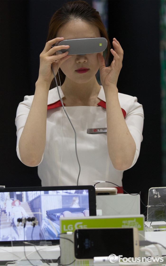 (서울=포커스뉴스) 17일 오전 서울 강남구 코엑스에서 열린 '월드 IT쇼 2016'의 LG전자 부스의 한 도우미가 VR 을 체험하고 있다.