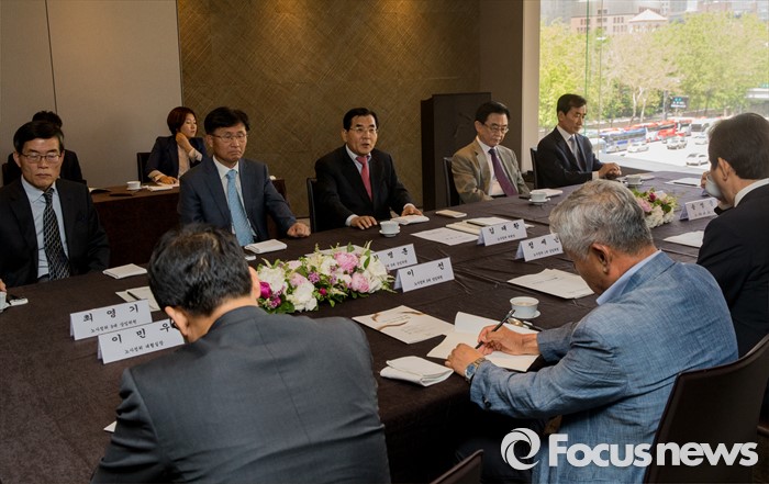 (서울=포커스뉴스) 17일 오후 서울 중구 플라자호텔에서 열린 경제사회발전 노사정위원회 역대 상임위원 간담회에 참석한 김대환(뒷줄 가운데) 위원장이 인사말을 하고 있다.