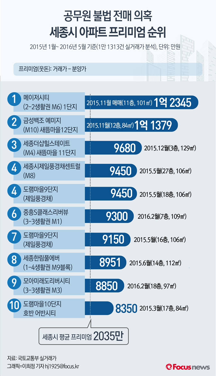 (서울=포커스뉴스) 16일 포커스뉴스가 2015년 1월부터 2016년 5월 최근까지 세종시에서 거래된 단지 전체 1만1313건의 국토교통부 실거래가를 분석한 결과, 평균 프리미엄은 2035만원으로 집계됐다. 공무원들의 불법 전매 의혹이 불거진 세종시 최고 프리미엄은 1억2345만원으로 집계됐다.