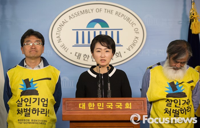 (서울=포커스뉴스) 가습기살균제 피해자와 가족모임(가피모)이 이언주 더불어민주당 의원과 함께 17일 오후 서울 여의도 국회 정론관에서 가습기 살균제 피해 대책마련 4당 원내대표 면담요구 기자회견을 하고 있다.