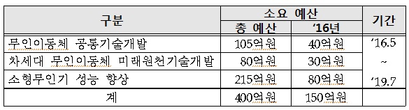 미래부는 무인이동체사업단을 5월 중에 발족시키고, 현재 한국연구재단을 통해 실시 중인 기술수요조사와 과제공모를 거쳐 하반기부터 사업에 본격 착수할 예정이다. 미래부 관계자는 “이번 사업을 통해 무인이동체 연구개발(R&D)을 효율화하고, 글로벌 시장 선도를 위한 차세대 무인이동체 시장에 대비하는 한편, 타분야의 뛰어난 ICT 기업들이 드론 등 무인이동체 분야에 적극 진출할 수 있는 생태계가 조성될 수 있을 것으로 기대한다”고 말했다.무인이동체 핵심기술개발사업 예상 소요 예산.<표제공=미래부>