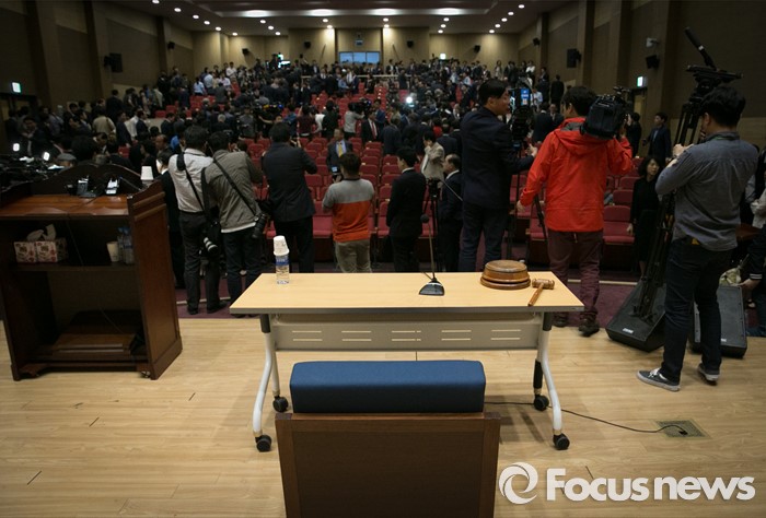 (서울=포커스뉴스) 17일 오후 서울 여의도 국회 의원회관에서 비대위 구성안 및 당헌 당규개정안 등 현안 처리를 위해 예정된 4차 새누리당 전국위원회에 의사봉이 놓여 있다. 이날 전국위원회의는 앞서 예정된 상임전국위원회를 개최해 당헌개정안 등을 심의할 예정이었지만, 친박계 의원들이 대거 불참해 참석자 미달로 회의가 열리지 못 했다.