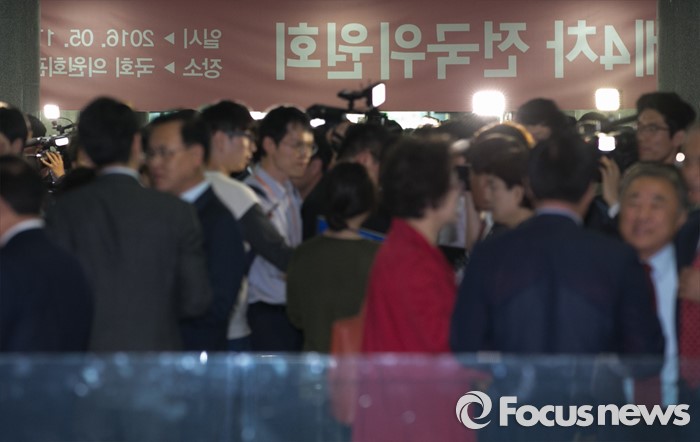 (서울=포커스뉴스) 17일 오후 서울 여의도 국회 의원회관에서 비대위 구성안 및 당헌 당규개정안 등 현안 처리를 위해 예정된 4차 새누리당 전국위원회가 무산된 후 상임고문단 등 참석자들이 퇴장하고 있다. 이날 전국위원회의는 앞서 예정된 상임전국위원회를 개최해 당헌개정안 등을 심의할 예정이었지만, 친박계 의원들이 대거 불참해 참석자 미달로 회의가 열리지 못 했다.
