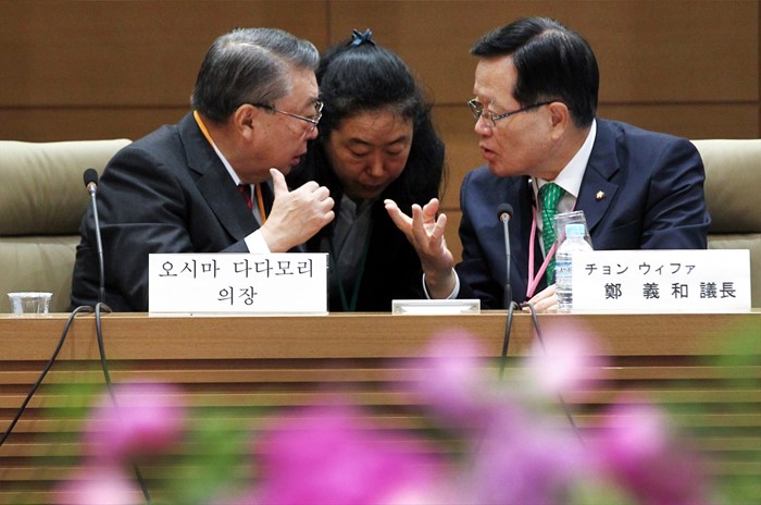 (서울=포커스뉴스) 정의화(오른쪽) 국회의장이 17일 오전 일본 도쿄 중의원 제1의원회관에서 열린 '1회 한·일의회 미래대화'에 참석해 오시마 다다모리 중의원 의장과 대화하고 있다. <사진제공=국회>