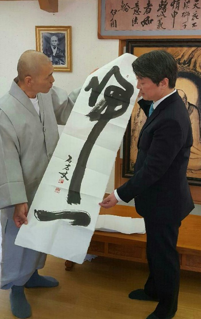 | △ 지선스님 붓글씨 전달받는 안철수 대표 |