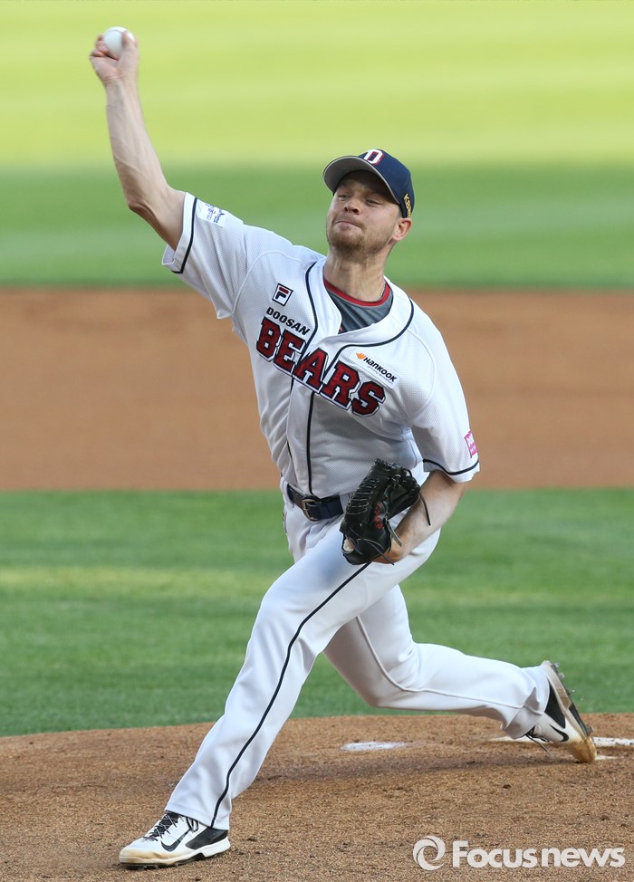 (서울=포커스뉴스) 17일 서울 잠실구장에서 열린 2016프로야구 KIA-두산 경기에서 1회초 두산 선발투수 보우덴이 투구하고 있다.