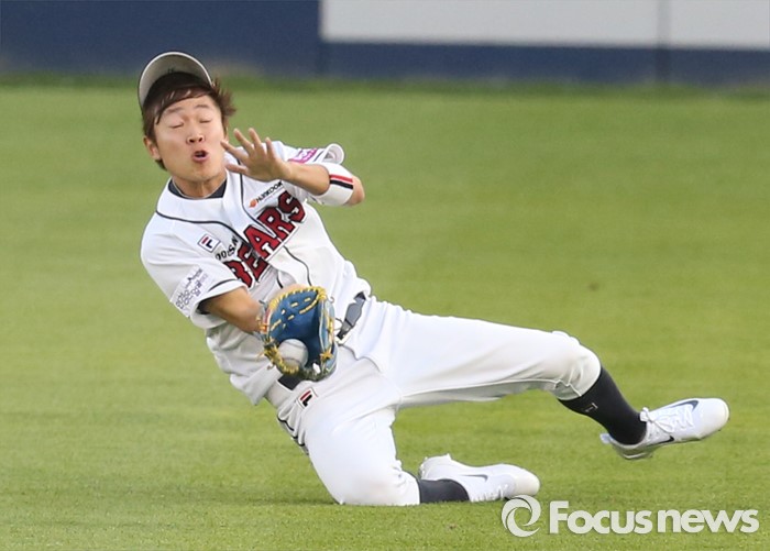 (서울=포커스뉴스) 17일 서울 잠실구장에서 열린 2016프로야구 KIA-두산 경기 2회초 무사 1,3루에서 두산 중견수 정수빈이 KIA 김호령의 뜬공을 슬라이딩하며 잡고 있다.