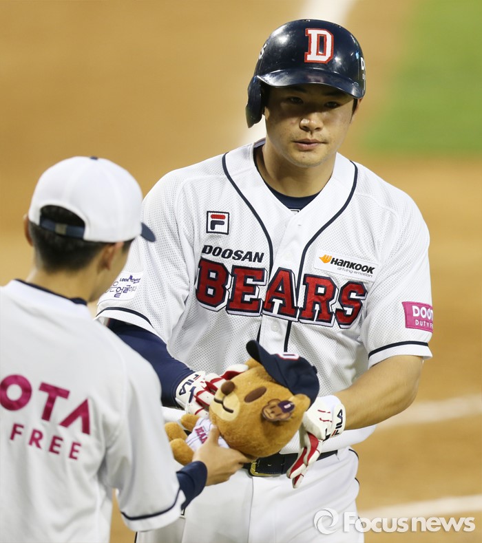 (서울=포커스뉴스) 17일 서울 잠실구장에서 열린 2016프로야구 KIA-두산 경기 4회말 2사후 두산 김재환이 KIA 지크의 초구를 때려 우월 홈런을 치고 홈인하며 인형을 받고 있다.