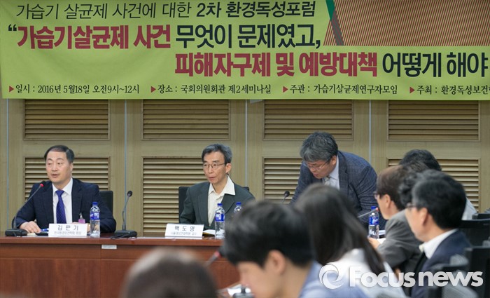 (서울=포커스뉴스) 18일 오전 서울 여의도 국회 의원회관에서 열린 가습기 살균제 사건에 대한 2차 환경독성포럼에 참석한 내빈들이 자리하고 있다. 왼쪽부터 김판기 한국환경보건학회장, 백도명 서울대보건대학원 교수, 임종한 환경독성보건학회장.