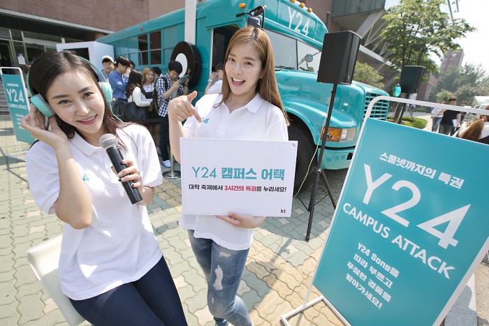 이번 이벤트는 17일 서강대를 시작으로 18일 서울시립대, 19일 성균관대, 20일 연세대, 26일 중앙대에서 매일 낮 12시부터 오후 3시까지 3시간 동안 진행된다. 19일과 20일에는 걸그룹 우주소녀의 스페셜 공연과 포토타임이 있을 예정이다.KT가 매일 3시간 동안 특정 대학교 축제에서 Y24 캠퍼스 어택을 진행한다.<사진제공=KT>