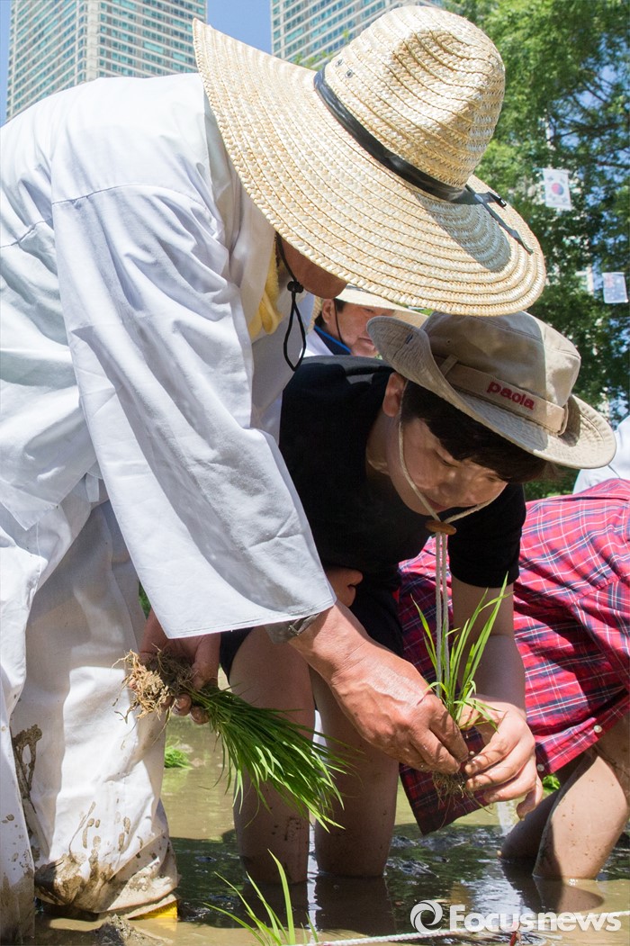 (서울=포커스뉴스) 18일 오전 서울 강남구 양재천 영동4교 인근 벼농사학습장에서 열린 전통 모내기 체험 행사에서 지역 주민이 어린이에게 모내기 방법을 설명하고 있다.