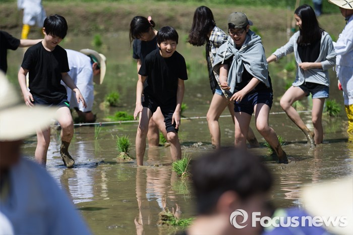 (서울=포커스뉴스) 18일 오전 서울 강남구 양재천 영동4교 인근 벼농사학습장에서 열린 전통 모내기 체험 행사에 참가한 주민들과 어린이들이 모내기를 준비하고 있다.