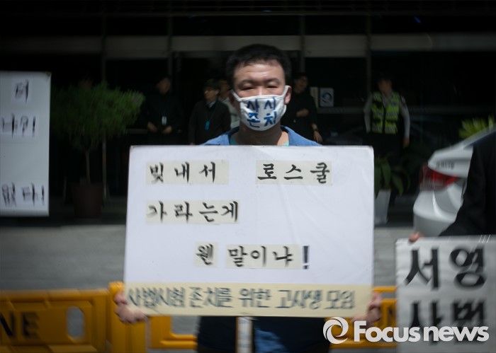 (서울=포커스뉴스) 18일 오전 서울 여의도 더불어민주당사 앞에서 사법시험 존치를 위한 고시생모임이 사시존치 법안의 법제사법위원회 전체회의 상정을 가로막은 더불어민주당 규탄시위를 하고 있다.