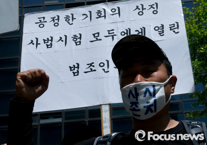 (서울=포커스뉴스) 18일 오전 서울 여의도 더불어민주당사 앞에서 사법시험 존치를 위한 고시생모임이 사시존치 법안의 법제사법위원회 전체회의 상정을 가로막은 더불어민주당 규탄시위를 하고 있다.