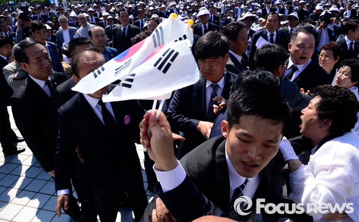 (광주=포커스뉴스) 36주년 5·18민주화운동 기념식이 거행된 18일 오전 광주 북구 운정동 5·18민주묘지에서 행사장에 참석하려는 박승춘 보훈처장이 5월 유가족의 항의를 받고 기념식장을 떠나고 있다.