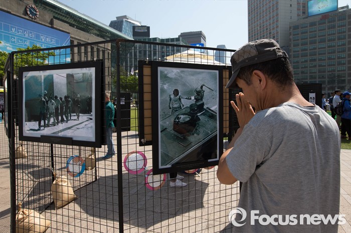 (서울=포커스뉴스) 18일 오전 서울 중구 서울시청 앞 광장에서 5.18 민주화운동 기념식이 열린 가운데 한 시민이 5.18 당시의 사진을 바라보고 있다.