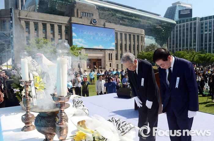 (서울=포커스뉴스) 18일 오전 서울 중구 서울시청 서울광장에서 열린 5.18민주화운동 제36주년 서울기념식에서 박원순 서울시장과 박석무(왼쪽) 행사위원장이 헌화를 하고 있다.